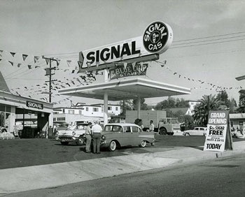 Founded in 1922 by Samuel Mosher in Long Beach, California. Had stations in seven western states. Sponsored the Whistler radio series on CBS 1942-55. Sold its retail gasoline sales in 1967 to Enco (same company as Esso). As the Signal Companies the business fizzled out before the end of the century.